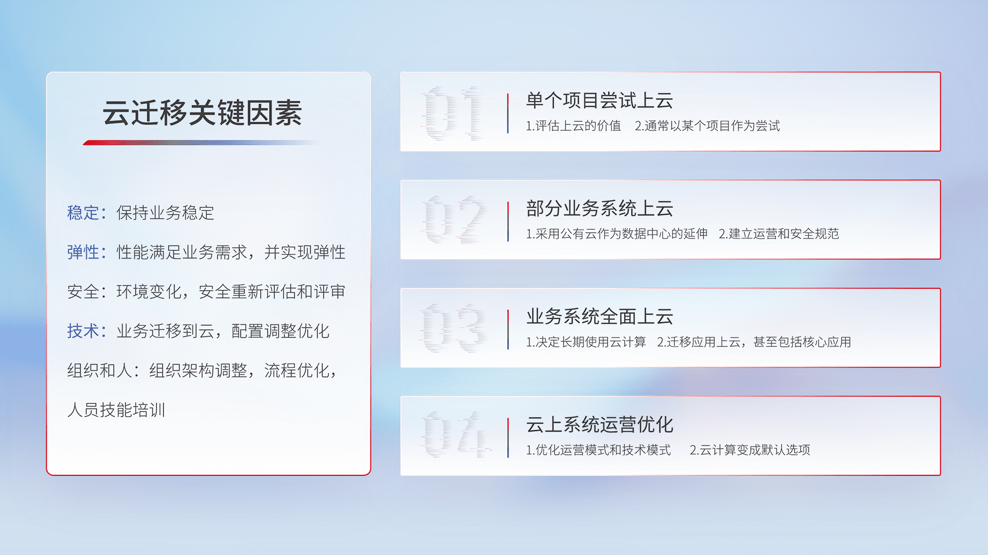 结合实际业务,,,,从规划设计、、、云平台选型、、、、云原生改造、、、数据迁移、、、、集成交付,,,迁移全过程为客户识别最佳上云路径,,,做好风险识别管理,,设计网络架构、、、身份权限、、安全审计合规、、、、操作审计、、、、日志审计、、、、监控告警策略、、、多站点容灾设计等,,,对云上基础设施进行整体规划,,,提升IT治理水平,,,以满足弹性、、高可用、、、、高性能的需求。。。