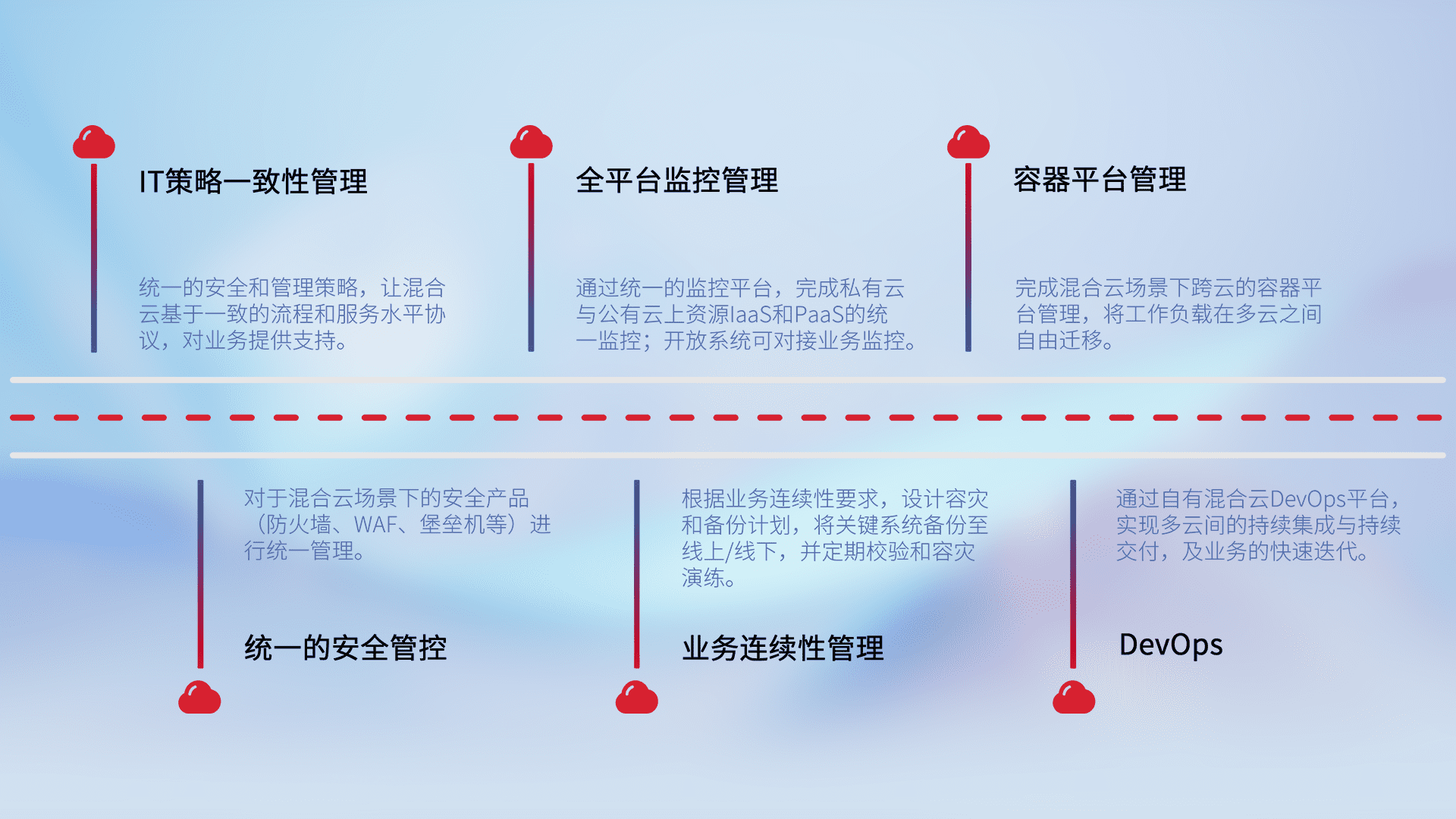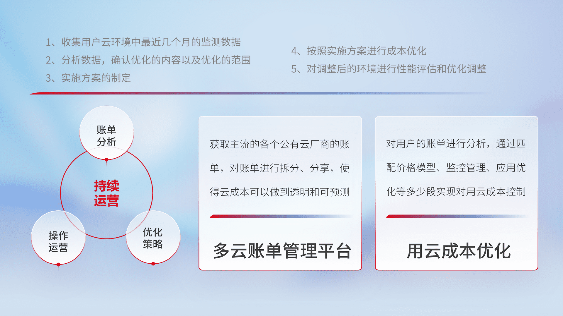 通过多云纳管,,以统一的资源数据模型把客户的云资源进行抽象和封装,,进而实现对多云资源的统一操作,,,,保障云资源管理的可靠性、、、、稳定性与可用性。。。量身定制化运维内容,,,配置、、、开发运维、、补丁管理、、、、备份、、、、监控、、认证和访问管理、、、审计和日常巡检等,,保障在用云过程中的可靠度,,稳定度以及高可用率。。