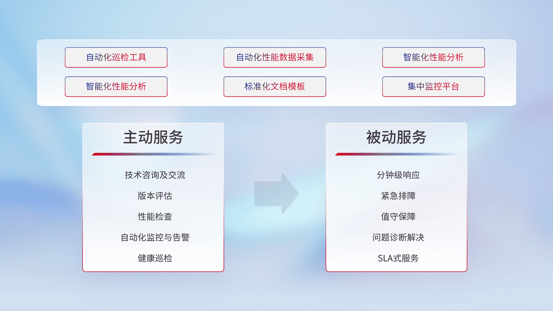 智能化工具和标准化文档,,,保障服务质量,,提供主动服务(包含技术咨询、、、、版本评估、、、性能检查、、、自动化监控与告警、、、健康巡检)和被动服务包含(分钟级响应、、紧急排障、、值守保障、、问题诊断解决、、、、SLA服务)。。。